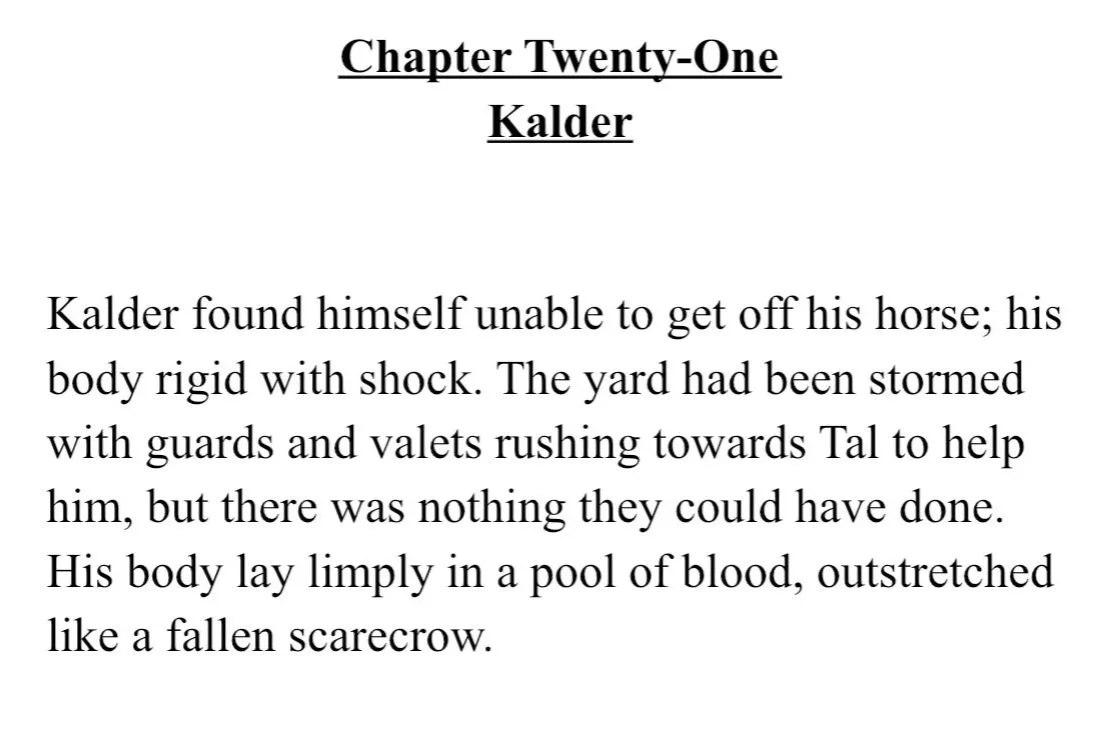 “There are things which I am not meant to teach you” he spoke solemnly, not breaking eye contact with Kalder, “things in history which I am meant to rewrite. You’re a bright boy, Kalder. How do you think the Kalloways went from rich men to Kings?”